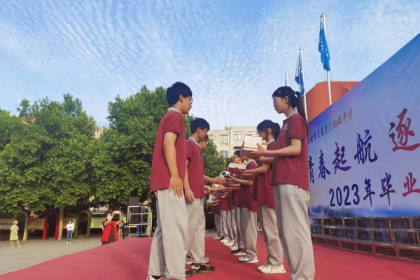 云程发轫,未来可期。临别之际,九年级全体班主任依次寄语毕业生,言辞恳切、感情真挚;全体九年级教师合唱《一路顺风》,祝愿孩子们一生风顺满帆;全体毕业生向老师行拜师礼并由毕业生代表向老师献上鲜花。师生代表朗诵《青春常在,母校于怀》,诵出了和谐的师生情,表达了对学生和学校的美好祝愿;全体九年级学生激情宣誓,铿锵有力的誓言在校园回荡;“昔我来思,桃李累累;今我往矣,杨柳依依”,学校领导及九年级全体老师站在状元门两侧欢送九年级毕业生,祝愿同学们“行行出状元”,做最好的自己,飞得更高,走得更远,演绎美好的人生。