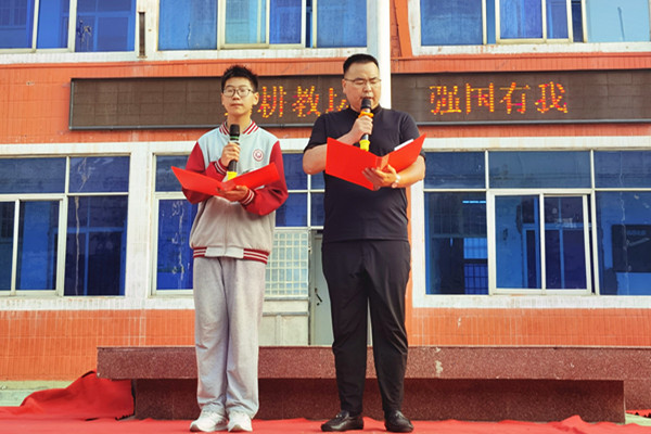 教导处副主任兼九一班班主任杨跃峰与学生郑皓文一起演讲