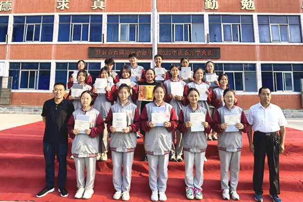 百舸争流乘风破浪,榜样引领励志笃行。校长刘俊颖和党支部书记付向丽代表学校向上学年各年级的优秀备课组颁奖。党支部副书记王建辉和政教主任刘建功为带领团队在2023郑州市中小学生操舞类锦标赛中荣获郑州市“校园健身操规定套路(初中组)”一等奖和“校园啦啦操花球规定套路(初中组)”一等奖的“悦动炫舞”啦啦操社团贾晓莉老师及团队颁奖。