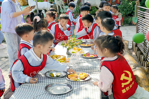 温馨的“品中秋美食”环节,则为这个特别的日子增添了更多甜蜜与温暖。大班孩子主动牵起小班弟弟妹妹的手,一起走向布置精美的餐台,共享月饼与各式水果。他们互相递送点心、笑语盈盈,“大手拉小手”的画面格外动人。老师们也借此讲述月饼所蕴含的“团圆”寓意,引导孩子们理解分享与感恩。在轻松愉快的氛围中,中华文化中“家”与“团圆”的情感内涵,悄然浸润每颗纯真的心灵。