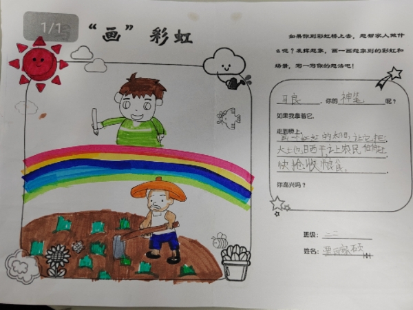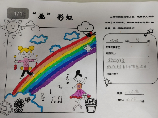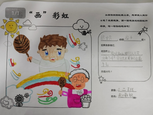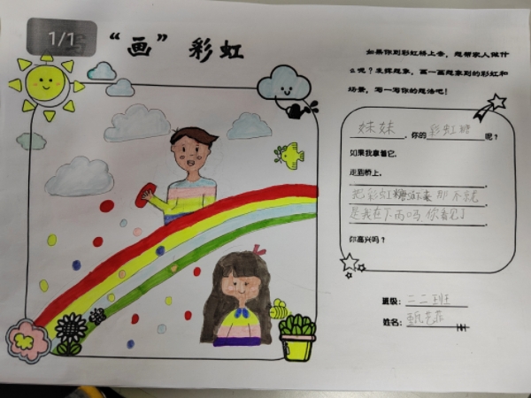 在孩子们的作品里,彩虹桥成了充满魔法的乐园。有的孩子拿起“马良的神笔”,在天空画出红红的太阳,让农民伯伯抓紧时间抢收粮食;有的孩子拿起“姐姐的小鼓”,在彩虹桥上敲出欢快的节奏,让音乐随彩虹的弧度流淌;有的孩子捧着“妹妹的彩虹糖”,在桥上轻轻一洒,让彩虹雨带着甜蜜落满人间;还有的孩子拿起“妈妈的扇子”,把彩虹当作滑梯,在七彩滑道上畅享清凉……他们或为奶奶扇起凉爽的风,或为爸爸变出酷炫的墨镜,或为姐姐画出花海,每一幅画都色彩斑斓,每一段文字都童趣盎然,将对家人的爱与关怀融入到天马行空的想象中。