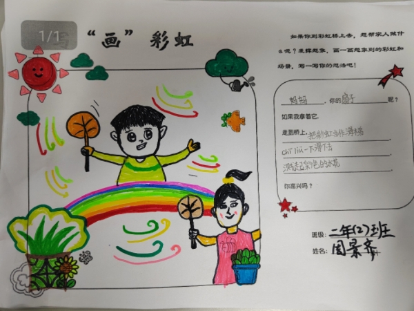 10月9日,博文路小学南校区二(2)班开展了一场以“‘画’彩虹”为主题的创意实践活动。孩子们以彩虹为媒,用画笔勾勒奇思,用文字抒发温情,在想象的天地里为家人编织出一个个七彩的梦。