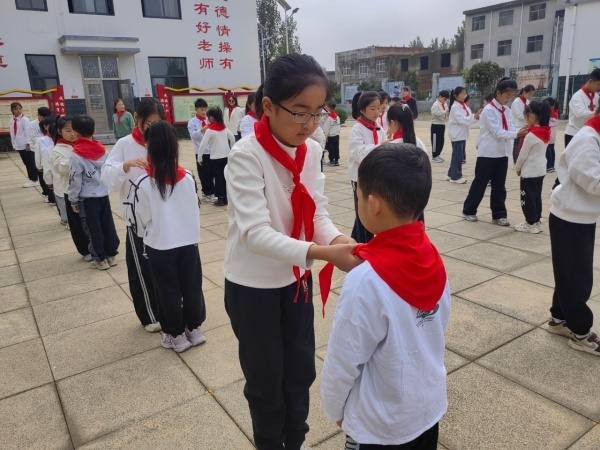 老队员为新队员佩戴红领巾