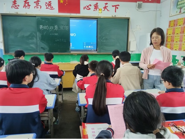 各班率先开展主题宣讲会,班主任向学生逐一发放《资助政策明白卡》,用通俗语言讲解核心内容:明确初中寄宿生每学期生活补助标准和脱贫家庭、低保家庭等资助对象范围,重点说明申请材料的递交与截止时间,现场为学生答疑解惑。在教学楼大厅宣传栏同步更新,以"国家资助,成就梦想"直观文字呈现主题;在学校门口安装宣传版面和意见箱等多种形式,让同学和家长通行时可及时了解政策内容。另外,家长微信群成为线上宣传主阵地,老师持续推送政策解读图文与明白卡电子版,针对"如何提交佐证材料""补助如何发放"等问题提供一对一解答,还特别提醒防范资助类电信诈骗,实现家校同步知晓政策。