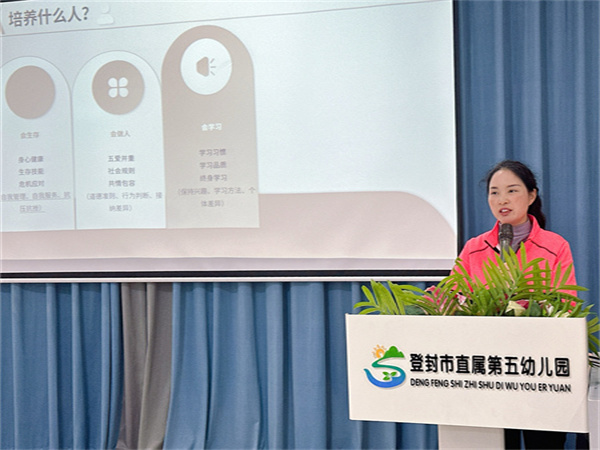 教研组长刘巧丽老师以《五维育人促新时代儿童全面发展》为主题进行分享,她以孩子一生发展为出发点,围绕“为谁培养人”“培养什么人”“怎样培养人”三大核心问题展开。在“培养什么人”层面,重点分享孩子学会生存、学会做人、学会学习、学会创造、学会联结的具体方法;在“怎样培养人”层面,则结合实践经验,介绍了通过观察游戏、分析幼儿、一对一倾听幼儿、开展以幼儿为本的自主游戏等育人路径。此外,还为老师们送上“职业成长三锦囊”:一是深耕自我,做优秀的教育者;二是用心陪伴,成为幼儿喜爱的老师;三是积极沟通,赢得家长的认可,助力大家在知行合一中收获职业幸福,为推动儿童全面发展凝聚教育合力。