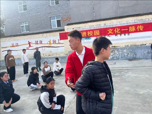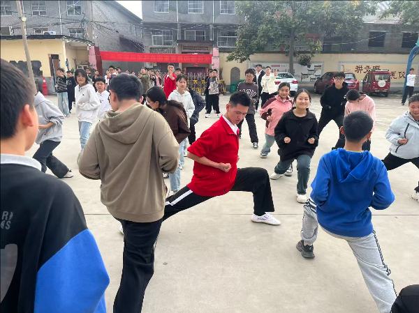仪式结束后,实践教学立即展开。操场被划分为5块独立区域,对应5个班级,每班配备2名教练。教学中,教练们格外认真:主讲教练先面向全班慢动作示范弓步冲拳,边做边讲解“后腿蹬直、拳眼向上”的细节;助教则逐人查看,发现学生马步重心偏移,便弯腰扶住其腰部调整站姿;遇到动作不协调的同学,还会单独拆解“出拳-收拳”的节奏,用“1、2”的口令帮其找准发力点。班主任在旁协助考勤,整个课堂既有训练的专注,又有互动的暖意。学生们从最初的生疏卡顿,到逐渐跟上节奏,眼神里满是投入。