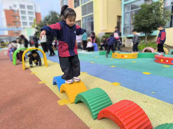 教学活动结束后,“能量补给·生活活动”与“活力绽放·韵律间操”环节接连展开。在生活活动中,孩子们自主分组如厕、按步骤洗手、有序取拿水果点心,熟练整理餐余的模样,让家长直观感受到孩子在自理能力、卫生习惯与秩序感上的显著进步;到了韵律间操时间,操场瞬间成为活力海洋,孩子们随动感音乐舒展肢体,精神饱满地完成每一个动作,其身体协调性与集体参与的热情,赢得家长们阵阵微笑。10:15开启的“挑战自我·体育游戏循环”更是将活动推向高潮,S型绕桩跑、平衡木、双脚跳圈、钻爬隧道等趣味关卡前,孩子们勇敢尝试、遵守规则,面对困难时不放弃的模样,让家长们深刻体会到孩子在体能与意志上的成长。
