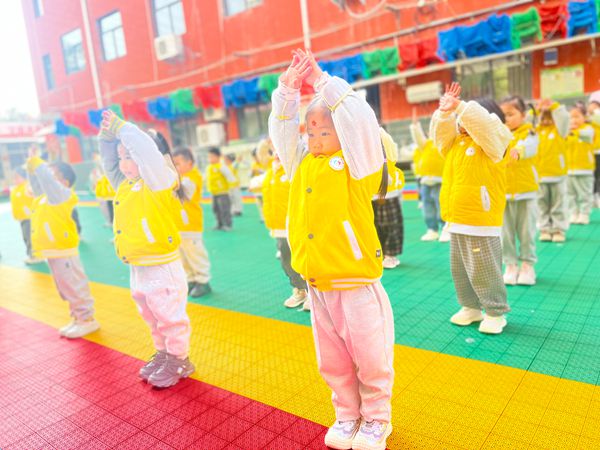 小班幼儿们动作虽稚嫩却认真,跟随教师节奏尽力舒展身体;教师领操姿态标准,用眼神与动作引导幼儿,展现出良好的引导力。