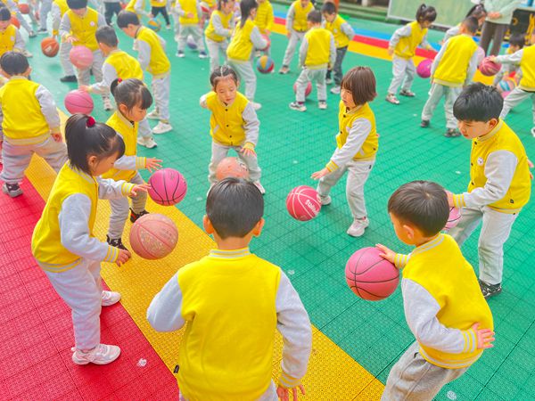 中班幼儿们双手拍球配合肢体动作,篮球在手中灵活跳动;教师团队排面整齐,动作连贯统一,将活力与默契传递给每一位幼儿。