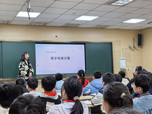 首先,李晓云老师进行《素养导向的小学数学单元整体教学》的读书分享;接着,张姗姗老师执教五年级《用字母表示数》一课,以抢微信红包的生活情境贯穿整节课,将抽象的数学知识与实际生活紧密联系,引导学生从区分“已知数与未知数”,到建立对“字母式既可以表示数量又可以表示数量关系”的认知,层层递进,帮助学生自然融入代数思维的建构。