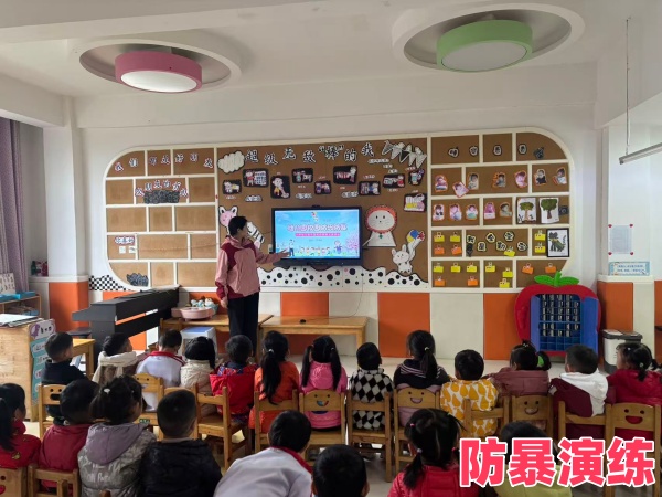 下午3点10分,演练开始,一名男士以给孩子送东西为借口进入幼儿园,在登记过程中,“歹徒”转身冲向孩子,从身上抽出大菜刀准备行凶,保安立即进行阻止,并在第一时间拉响警报。校园内随即响起急促的警报声,应急领导小组成员、保安人员立即手持防爆器械齐心协力与“歹徒”进行周旋,不让“歹徒”接近孩子们,各班教师迅速组织幼儿返回教室。教室里,老师们紧闭门窗,用桌椅等东西堵住门口,指导孩子赶紧躲到安全地带,老师们也拿起凳子、扫帚等物品,时刻准备与“歹徒”战斗。警报解除后,班级老师及时对幼儿进行了心理疏导,消除幼儿对演练的恐惧心理,并且各班教师组织幼儿开展了“反恐防暴”安全知识小课堂。