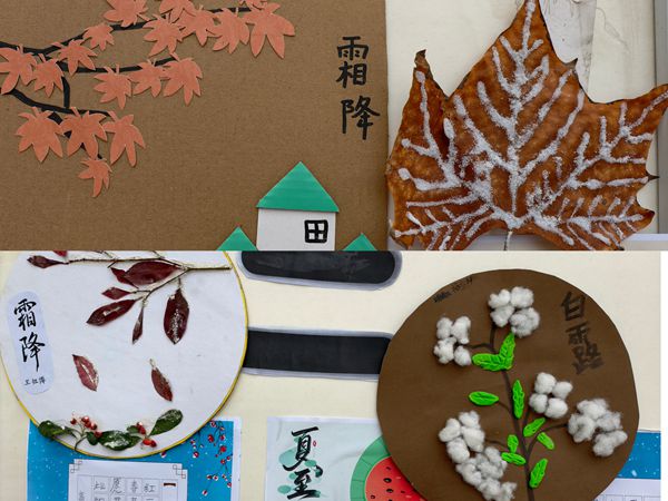 展览现场亮点纷呈:学校文化宣传栏的“重阳节安康”主题板上,整齐排列24张学生书法和手工作品;菊花、山水等插画与“登高”、“霜降”等文字相映成趣;二十四节气宣传板以图文详解各节气习俗,生动展现传统文化魅力;学生以书法誊抄经典诗词、用黏土干花制作立体画,更有“霜降”“白露”主题手工艺品——蓝底绿叶配红果、以食盐和棉花模拟霜降景象,童趣中饱含文化巧思。老师们从数百份投稿中精选作品精心布展,课余时间学生们来到教学楼前围聚观赏,热议“这幅画让我仿佛看到了真实的霜降”、“我要把孝亲画带给爷爷奶奶”……