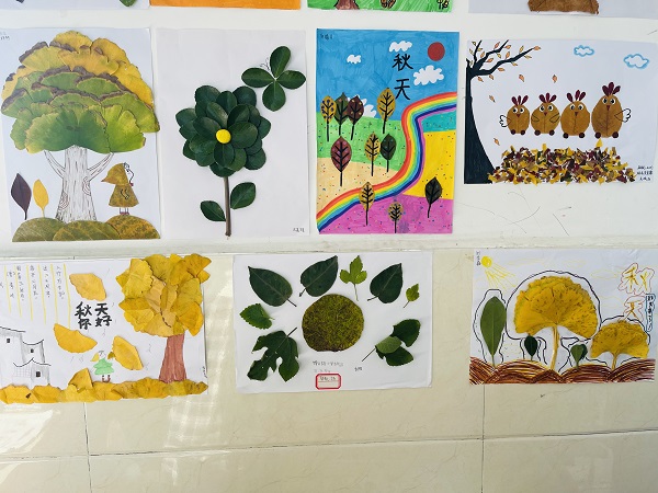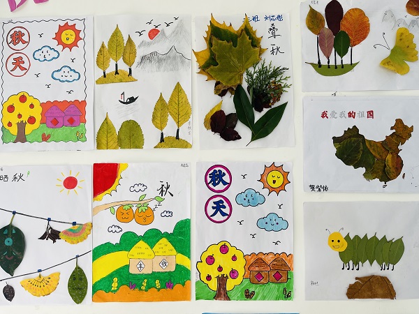 走进展示区,琳琅满目的树叶画让人目不暇接。有的作品以“秋天”为主题,用金黄的稻田和可爱的房屋,搭配手绘的太阳、云朵,生动展现了秋日田园的丰收景象;有的则是纯树叶创作,银杏叶拼成的大树黄绿相间,仿佛在微风中轻轻摇曳,叶片组成的蝴蝶振翅欲飞;还有用树叶拼出的中国地图,表达了“我爱我的祖国”的赤诚之心。