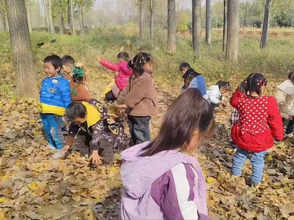 一群孩子在铺满落叶的树林里,在老师的陪伴下愉快地玩耍、探索