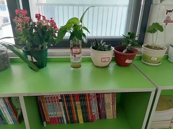 图书柜绿植布置同样精彩纷呈。各班级挑选了绿萝、多肉等易养护的植物,搭配小巧的花盆和可爱的摆件,为图书柜增添了一抹绿意。绿植上还配有标签,标注了植物名称和养护小贴士,既美化了环境,又培养了学生的责任感。