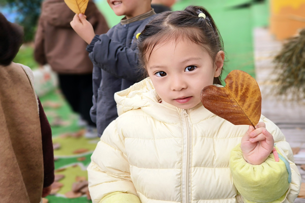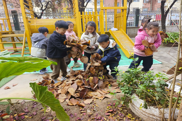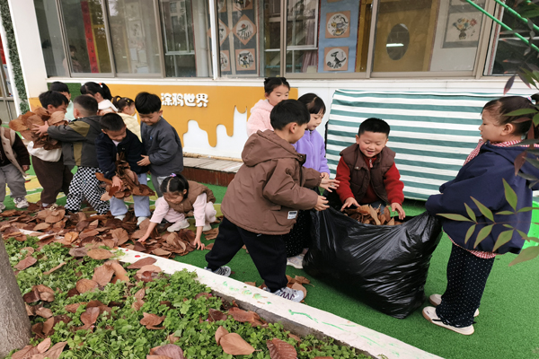 收集来的落叶并未被随意丢弃,一部分制成了落叶标本,还有一部分成为了资源化利用的“宝贝”。在老师的讲解下,孩子们了解到,这些落叶经过集中堆放、科学发酵等处理,能够转化为富含养分的有机肥料。这些由落叶“变身”而来的肥料,随后被用于园内的绿化养护,反哺幼儿园的花草树木,实现“取于自然,用于自然”的生态循环。