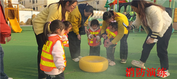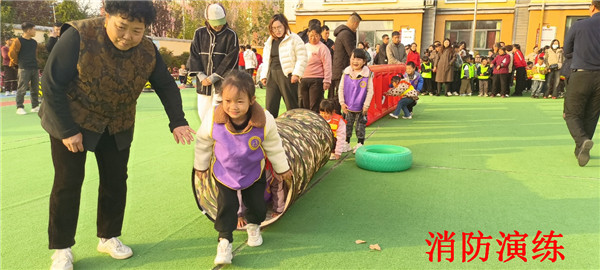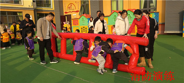 活动以室内安全宣讲拉开序幕。教员龚帅家结合火灾案例,向家长们详细讲解“预防为主、防消结合”的消防理念,普及火灾预防与逃生要点。随后的户外环节氛围升温,警报声中,孩子们身着荧光安全背心,以湿毛巾掩口鼻,在教职工引导下沿安全通道快速撤离,规范动作尽显“小英雄”风采。亲子互动环节里,充气障碍穿越、模拟灭火器实操等项目依次展开。孩子们套上小小消防员反光背心,与家长协作钻过迷彩隧道、俯身“扑灭”轮胎道具里的模拟烟雾,在趣味比拼中掌握基础消防技能,更养成勇敢协作的品质。