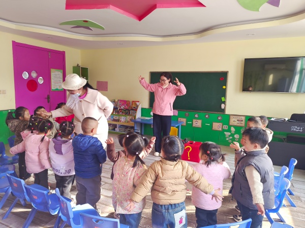随后,李培芹老师带领小班幼儿走进《找朋友》的温馨世界。李老师用亲切温柔的语言引导幼儿理解歌词含义,通过“敬个礼、握个手、拥抱、再见”等互动环节,让孩子们在欢快的旋律中学习交往礼仪、感受友谊的温暖。孩子们在活动上主动握手、大胆表达,在音乐游戏中学会分享与合作,既加深了对音乐节奏的感知,也培养了良好的社交能力。