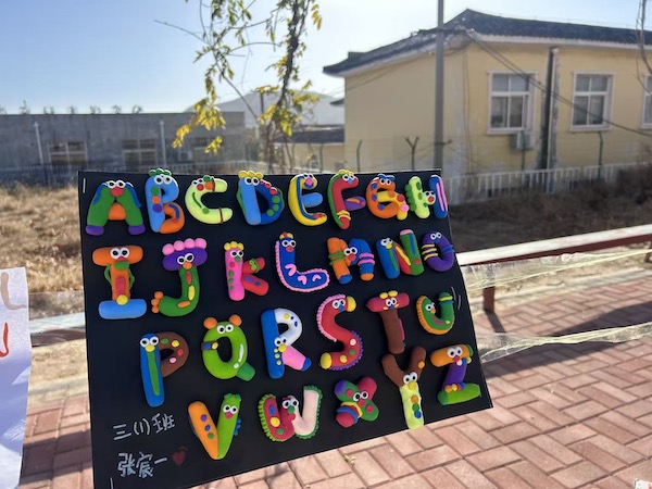 活动的主题是“我的创意字母卡”。对于三年级的同学们来说,英语学习从书本走向了指尖。孩子们利用五彩斑斓的橡皮泥、轻黏土,以及收集来的树叶、花瓣等自然植物,亲手制作独一无二的英文字母卡片。活动现场,孩子们兴致勃勃,有的用轻黏土捏出立体的“A”,有的用树叶拼贴出圆润的“O”,还有的将花瓣装饰在字母“F”周围。这种将英语学习与手工、自然探索相结合的方式,不仅让抽象的字母变得具体而生动,更在孩子们心中播下了探索与创造的种子。