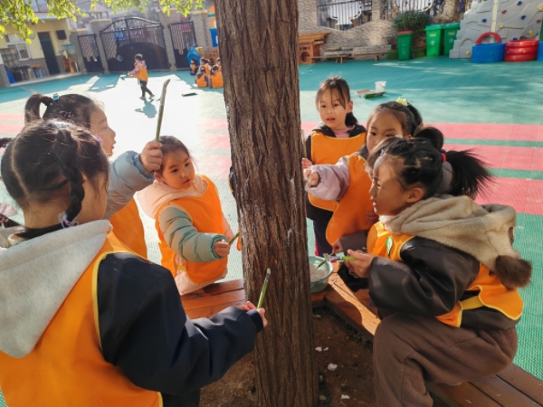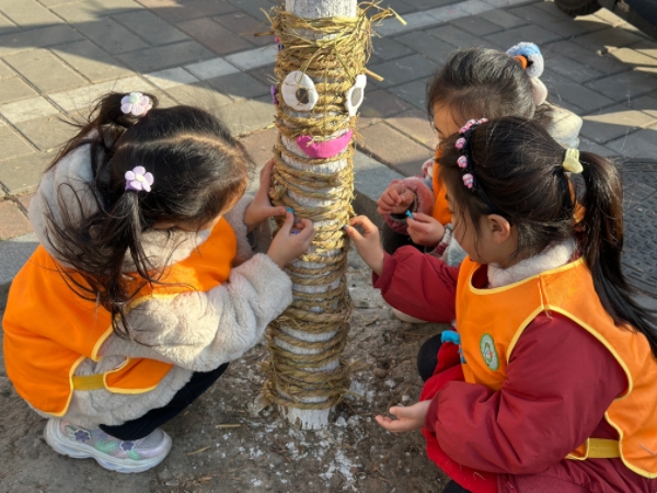 活动伊始,教师以趣味谈话导入:“寒冷的冬天来了,小朋友们穿上了厚厚的棉袄,大树妈妈该怎么过冬呢?”引发幼儿热烈讨论。随后,孩子们在教师的带领下行走于幼儿园内外,近距离观察小雪节气后花草树木的变化——落叶飘零的树枝、褪去翠绿的枝干,让幼儿直观感受冬日里植物的生存状态。在观察中,教师顺势科普树木过冬的小知识,介绍石灰水杀菌防虫、麻绳防寒保暖的作用,为后续实践活动奠定基础。