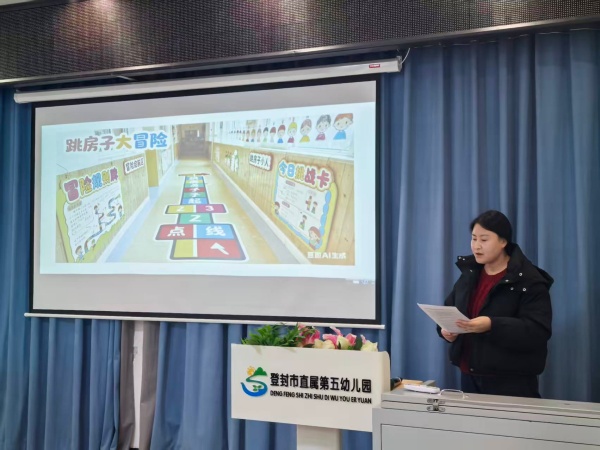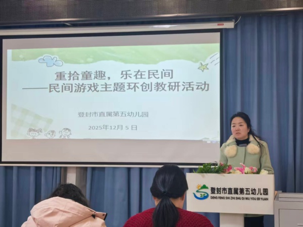 为挖掘民间游戏的教育价值,丰富幼儿环创活动形式,12月8日下午,登封市直属第五幼儿园组织全体教师开展“重拾童趣 乐在民间”民间游戏主题环创教研专题活动,本次教研由业务园长刘丹丹主持。