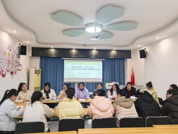 各班教师分享后,老师们针对其他班环创主题的可操作性、年龄段适配性等问题展开了激烈的研讨,明确主题后,老师们表示将在传统民间游戏基础上创新形式,让环创更贴合幼儿年龄特点,同时融入民间游戏元素。
