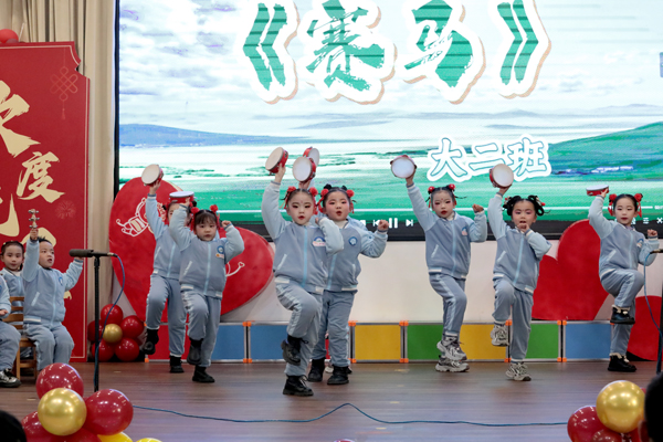 随后,精彩节目轮番上演。由大班舞蹈队带来的开场舞《马年闹新春》瞬间点燃全场,孩子们活泼可爱的舞姿洋溢着纯真与活力。紧接着,打击乐展演环节成为本次音乐会的重头戏:大五班演绎的《春节序曲》锣鼓铿锵,年味十足;大一班《森林狂想曲》清新灵动,仿佛带领大家漫步自然;中一班《娃哈哈》充满民族风情,稚趣盎然;大二班《赛马》节奏激昂,气势欢腾;大三班《小燕子》婉转轻柔,温情流淌;大四班《拉德斯基进行曲》整齐昂扬,赢得阵阵掌声;中三班《小老鼠打喷嚏》妙趣横生,令人忍俊不禁;中二班《巡逻兵进行曲》精神抖擞;中四班《桃花笑》则甜美欢快,仿佛春风拂面。