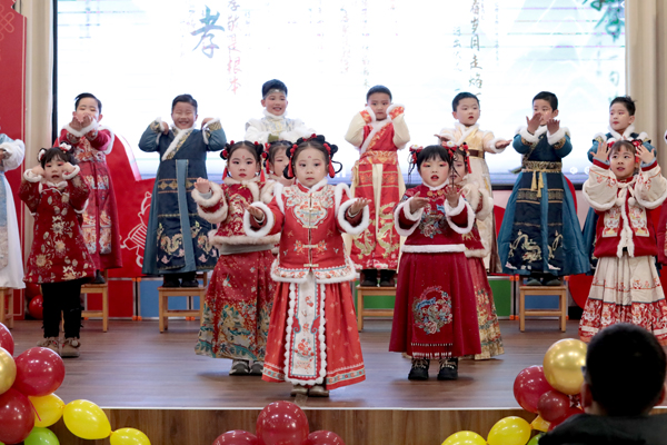 多元艺术表演环节同样精彩纷呈:戏曲表演《说唱脸谱》韵致十足,展现了国粹的魅力;非洲鼓《云宫迅音》节奏奔放,融合了异域风情与现代韵律;街舞《霍元甲》则以动感舞步诠释了传统精神的当代融合,引人注目。音乐会的尾声,全体参演幼儿代表共同表演手语舞蹈《中华孝道》,在温情款款的旋律中传递感恩与传承之美。