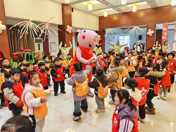 活动在欢快的新年音乐声中拉开帷幕,孩子们踏着轻快的步伐有序入场。活动特邀佩奇、熊大、财神三位“神秘嘉宾”惊喜现身,瞬间点燃了现场的欢乐气氛。嘉宾们与孩子们热情互动,“我来问你来答”趣味问答妙趣横生,“蹲蹲乐”游戏让孩子们笑作一团,欢乐舞会更是将氛围推向高潮,孩子们和嘉宾手拉手尽情舞蹈,童趣飞扬。