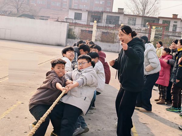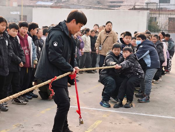 比赛现场气氛热烈,参赛同学们紧握粗麻绳,身体后仰、双脚蹬地,在“一二、一二”的号子声中齐心发力。他们虽身着厚重冬衣,却丝毫不影响拼搏的热情,一张张涨红的小脸上写满了专注与坚持。老师们更是全程投入,握拳呐喊、声嘶力竭地为学生加油;