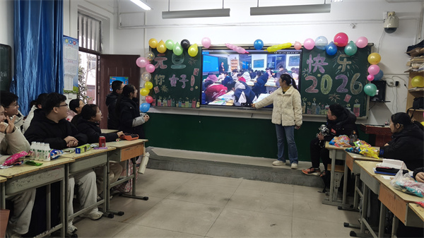 赛场之外,各班级的联欢活动同样精彩纷呈。教室里张灯结彩,彩带与气球交织出浓浓的新年气息。同学们各展所长,唱歌、跳舞、小品、朗诵轮番上演,每一个节目都凝聚着大家的心血与创意。悠扬的歌声回荡在教室,欢快的舞步点亮了青春,师生们围坐一堂,在欢声笑语中互道祝福,在其乐融融中感受着集体的温暖。此次元旦文体活动,不仅让师生们在紧张的学习之余放松了身心,更增强了班级的凝聚力与向心力。赛场上的汗水与欢笑,教室里的歌声与祝福,都将成为这个冬日里最温暖的记忆。新的一年,我校学子也必将带着这份拼搏的勇气与团结的力量,在成长的道路上逐梦前行,书写更加灿烂的青春篇章!
