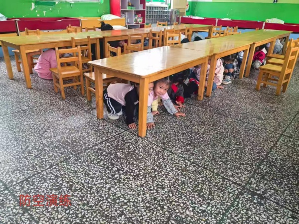 当“预先警报”响起,各班教师迅速关紧门窗,有序组织幼儿就近寻找桌子、墙角等安全区域,一边引导幼儿躲避危险,一边指导他们正确的躲藏姿势。“空袭警报”响起,各班教师立刻指导幼儿用手保护头部,蜷曲身体、降低重心,藏在桌子底下。“解除警报”响起时,各班教师组织幼儿沿着预定路线快速、有序地疏散到操场。到达安全区域后,各班教师立即清点人数并上报总指挥,确保全体师幼安全撤离。