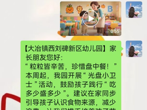 老师们在各班家长微信群中发出了节约粮食的相关视频,向家长们宣传节约粮食的重要性,通过线上分享,家园携手,共同在孩子们心中播下“节约”的种子,营造了良好的教育氛围。